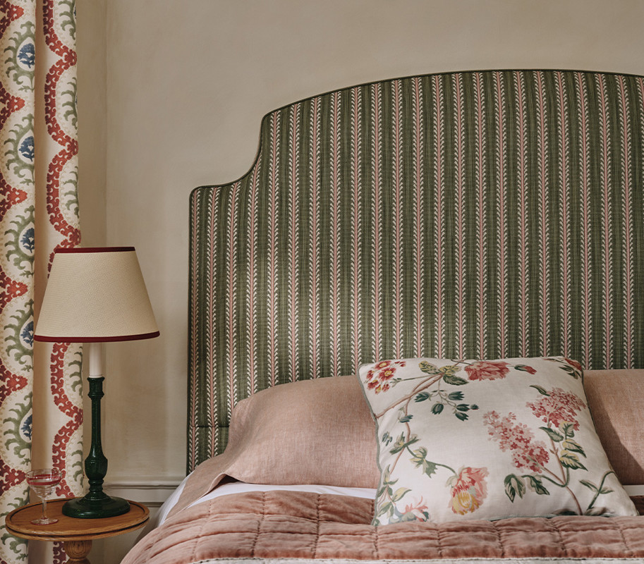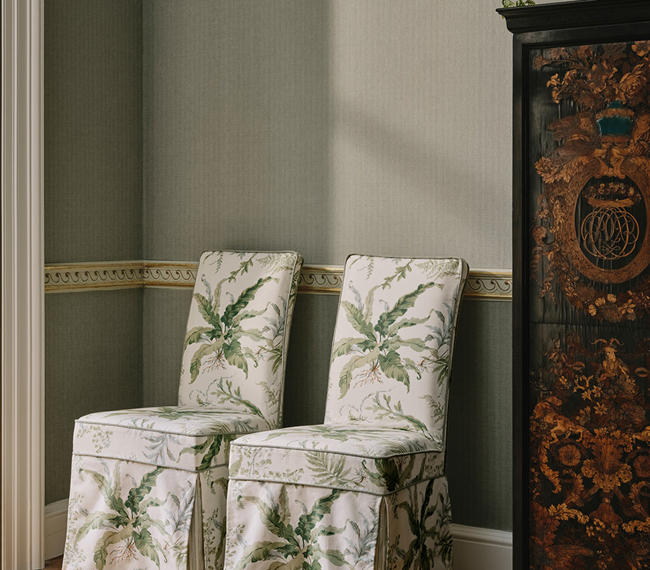 Across printed fabrics, embroideries, refined weaves and wallcoverings, the designs explore a measured interplay of pattern, texture and colour. Traditional techniques and archival references are quietly reinterpreted, from fluid stitchwork and handprinted forms to the structure of woven stripes and the understated appeal of pure, natural linen.
