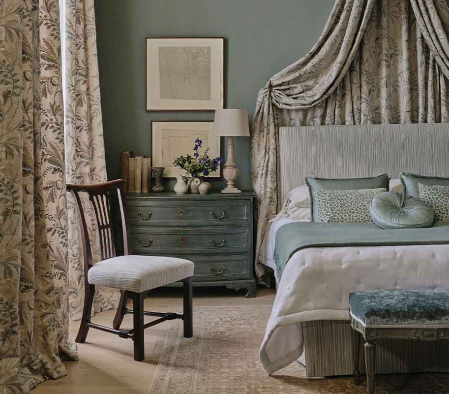 Bathed in the soft glow of butter yellow, this bedroom radiates warmth and sophistication. This timeless shade is highlighted with moiré weaves, fresh pinstripes, and delicate sheers that fill the space with light and ease.