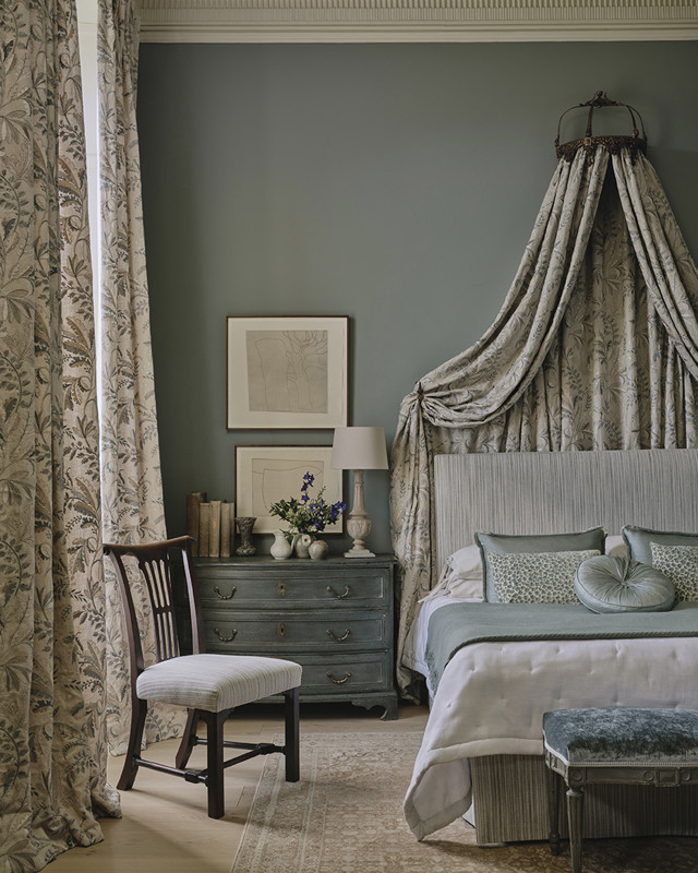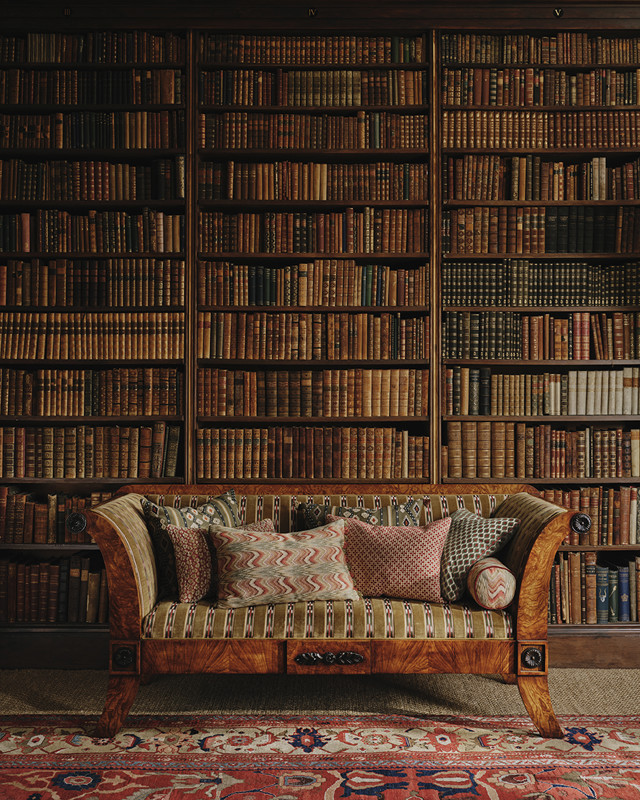 Tall windows are dressed with cascading drapery, while a decorative embroidery adds refinement to the entrance hall. Grand canopy beds become luxurious focal points of comfort and splendour. In the library, a towering bookcase filled with antique editions sets the stage for quiet reflection.